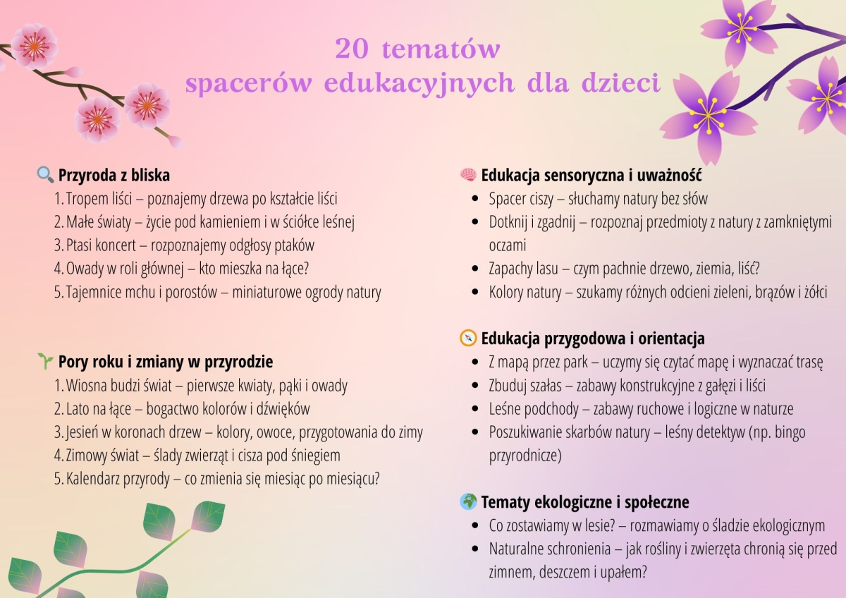 W dobie cyfryzacji i rosnącego tempa życia coraz częściej szukamy sposobów na przywrócenie dzieciom kontaktu z naturą. Rozwiązaniem tego problemu są między innymi spacery edukacyjne, którą są nie tylko doskonałą okazją do oderwania się od ekranów, ale też szansą na naukę przez doświadczenie, działanie i obserwację. Dla rodziców to sposób na wartościowy czas z dzieckiem, a dla nauczycieli i edukatorów – innowacyjna forma pracy dydaktycznej. Teren (np. las, park, łąka) staje się żywą klasą, w której przyroda gra pierwsze skrzypce.