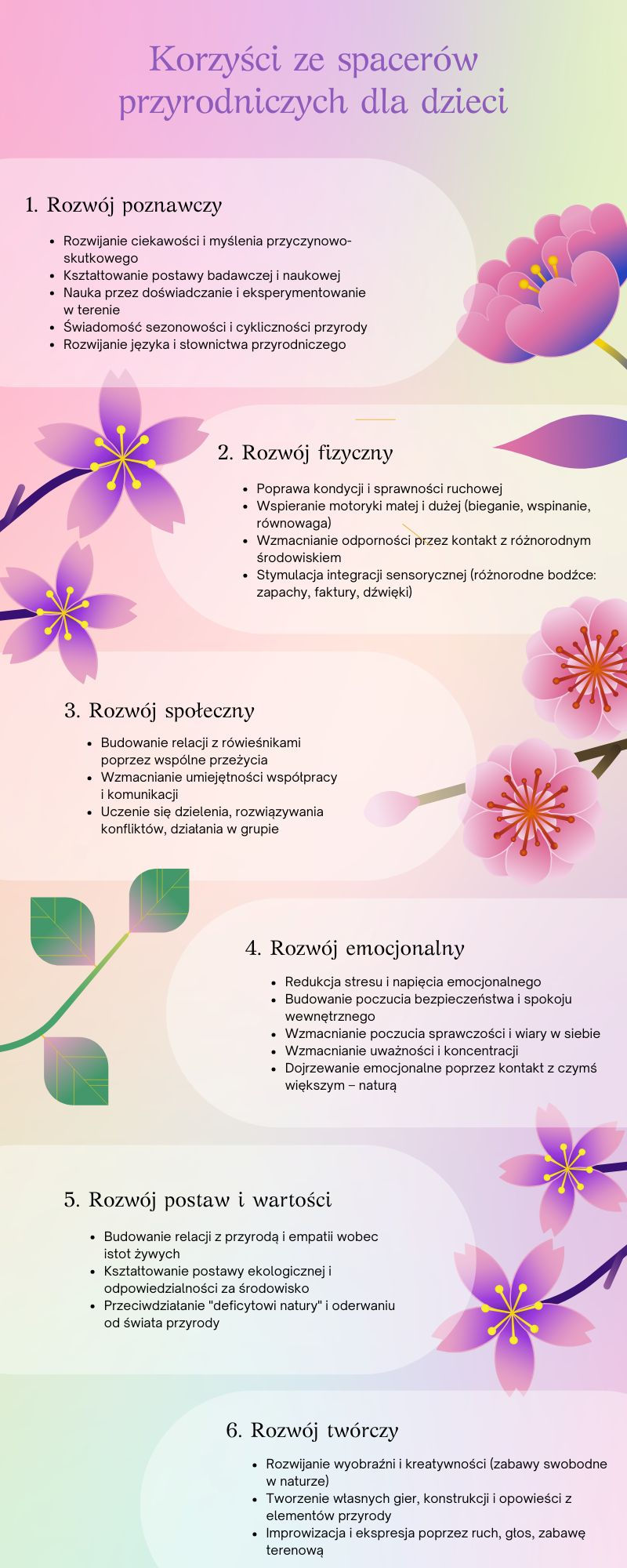 Spacer edukacyjny doskonale wpisuje się w realizację podstawy programowej różnych przedmiotów: przyrody, biologii, geografii, a nawet języka polskiego. Można go traktować jako lekcję w terenie, której efekty są trwałe i praktyczne. Co więcej, tego typu zajęcia sprzyjają integracji wiedzy z różnych dziedzin, ucząc dzieci myślenia całościowego i dostrzegania związków między zjawiskami. Edukacja nieformalna realizowana podczas spacerów uczy też samodzielności, inicjatywy i odpowiedzialności.